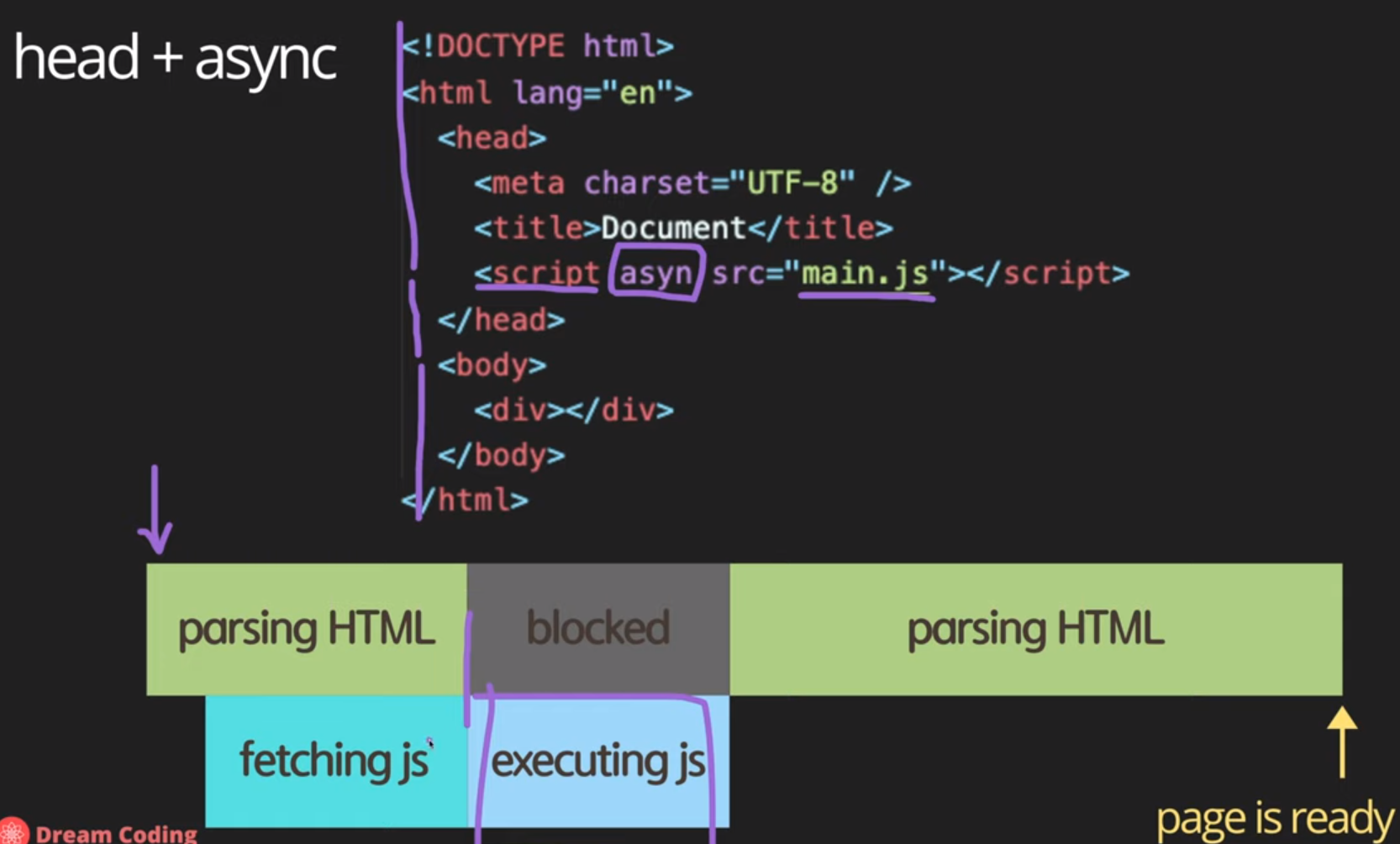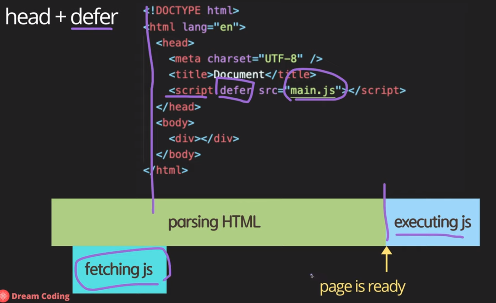 장점: body 끝에 사용하는 것보단 다운받는 시간 절약할 수 있다 단점:html parsing 되기도 전에 querySelector를 이용해 dom 요소를 조작한다고 하면 html 요소가 정의되기 전일 수도 있음